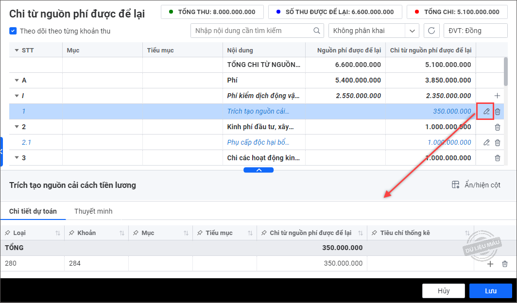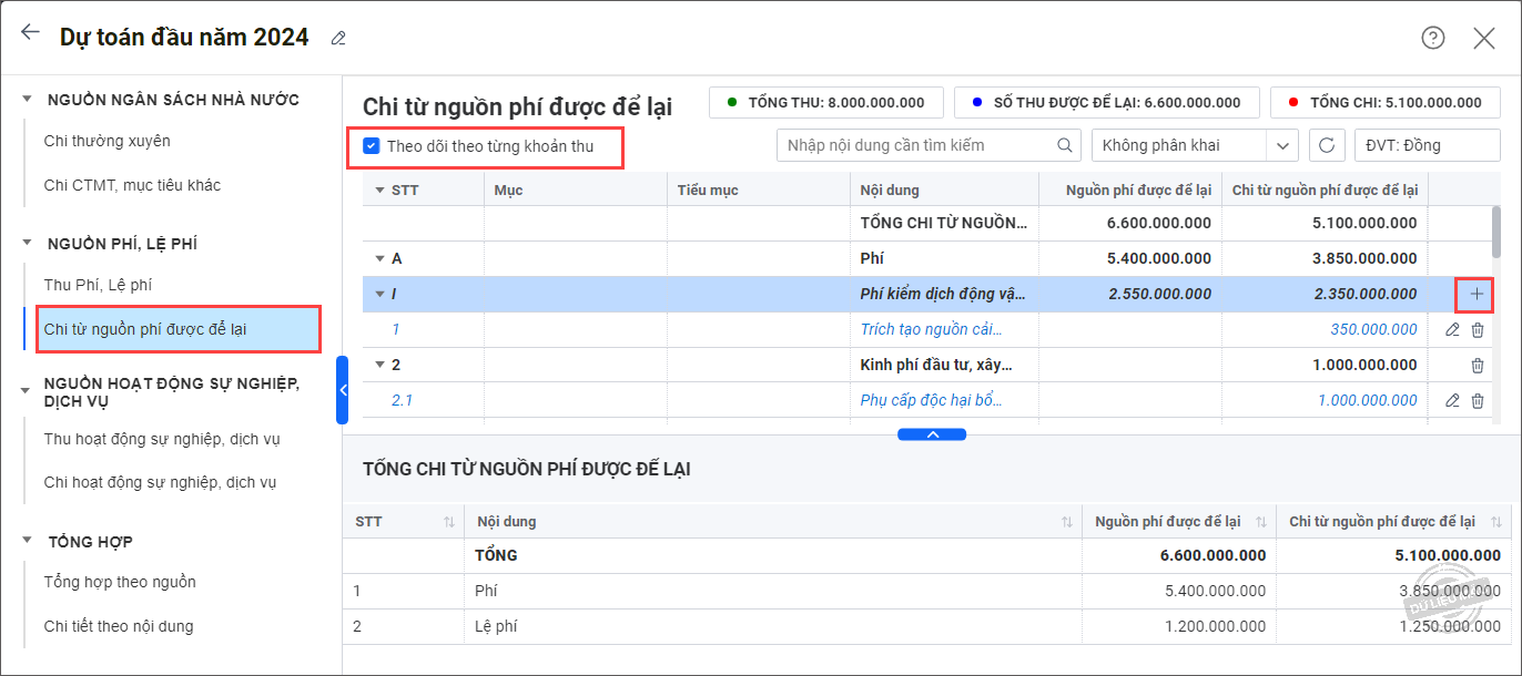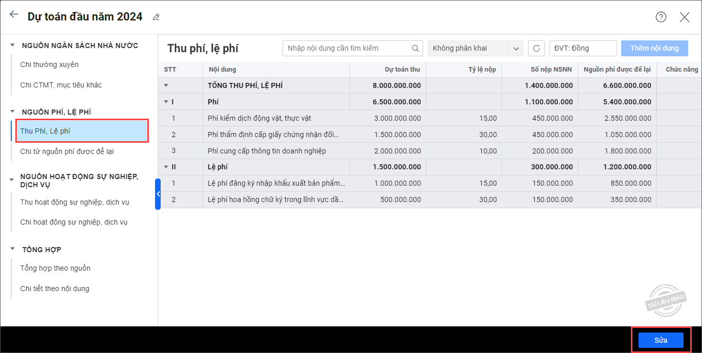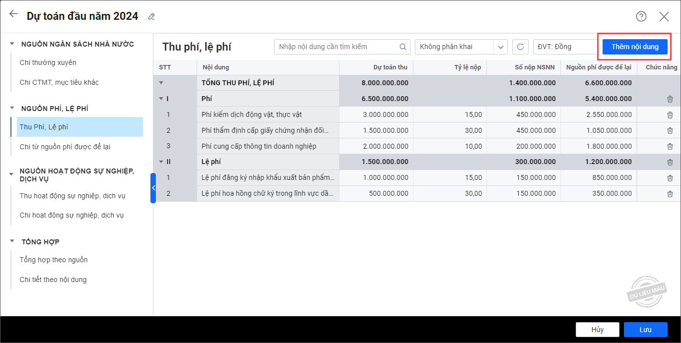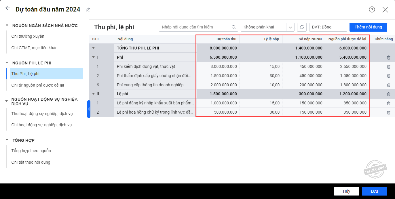 4. Nhập dự toán cho các nội dung thu phí, lệ phí. Sau đó nhấn Lưu.