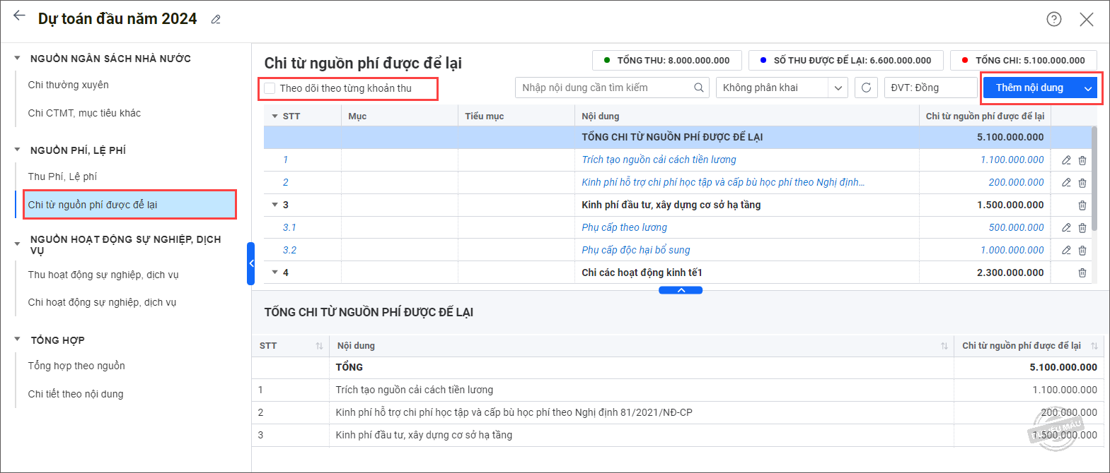 3. Trường hợp cần thêm nội dung chi, nhấn Thêm nội dung.
