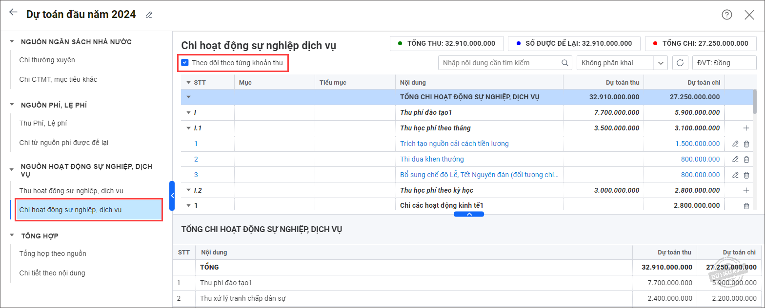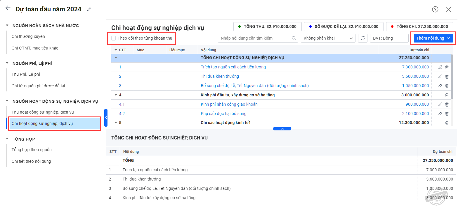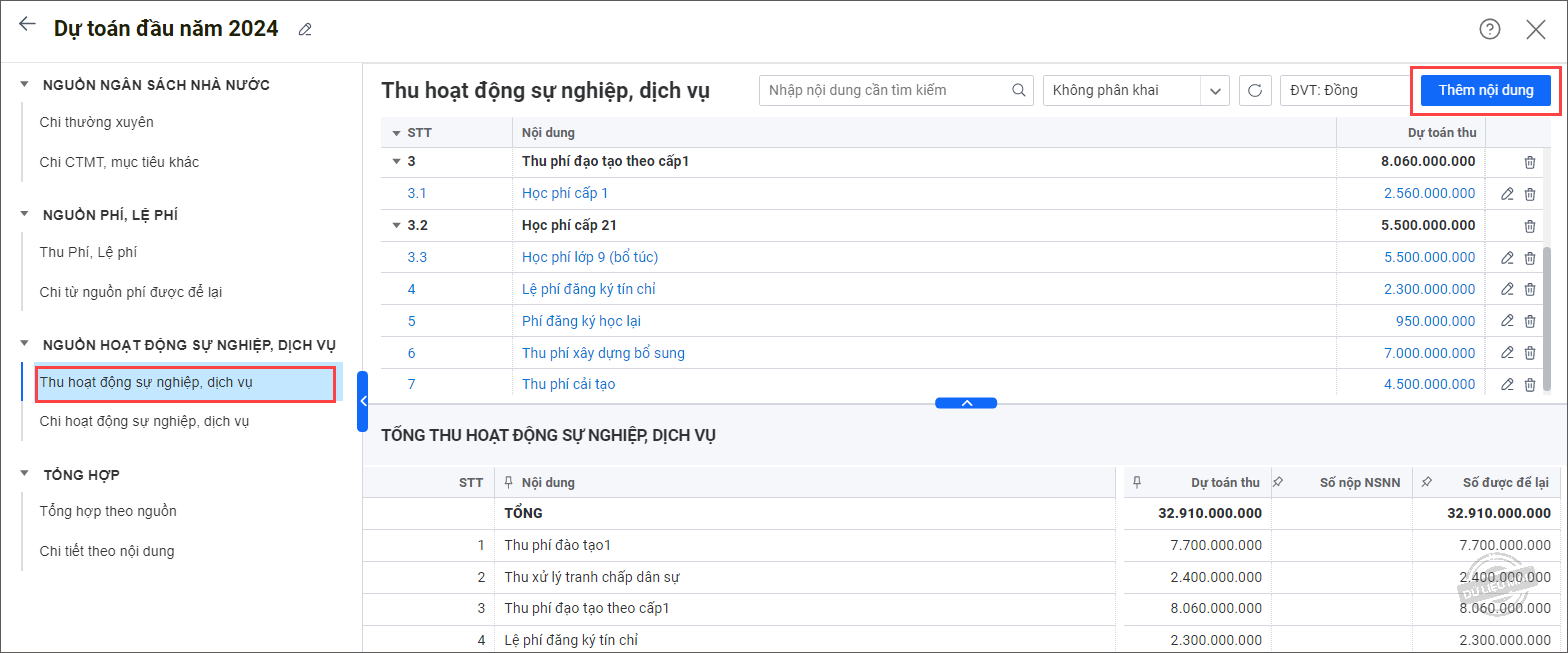 3. Nhập dự toán cho các nội dung thu hoạt động sự nghiệp, dịch vụ. Sau đó nhấn Lưu.
