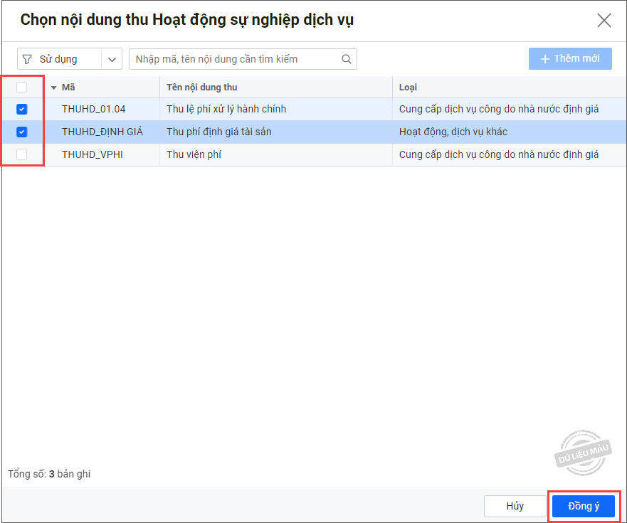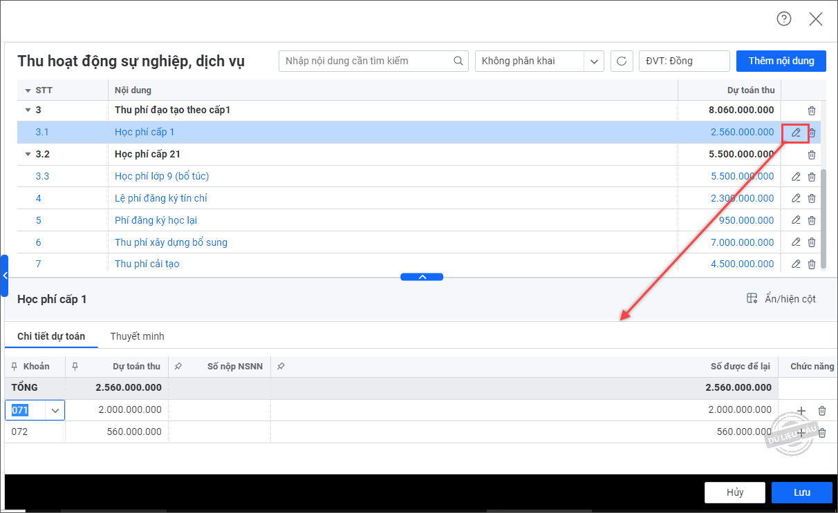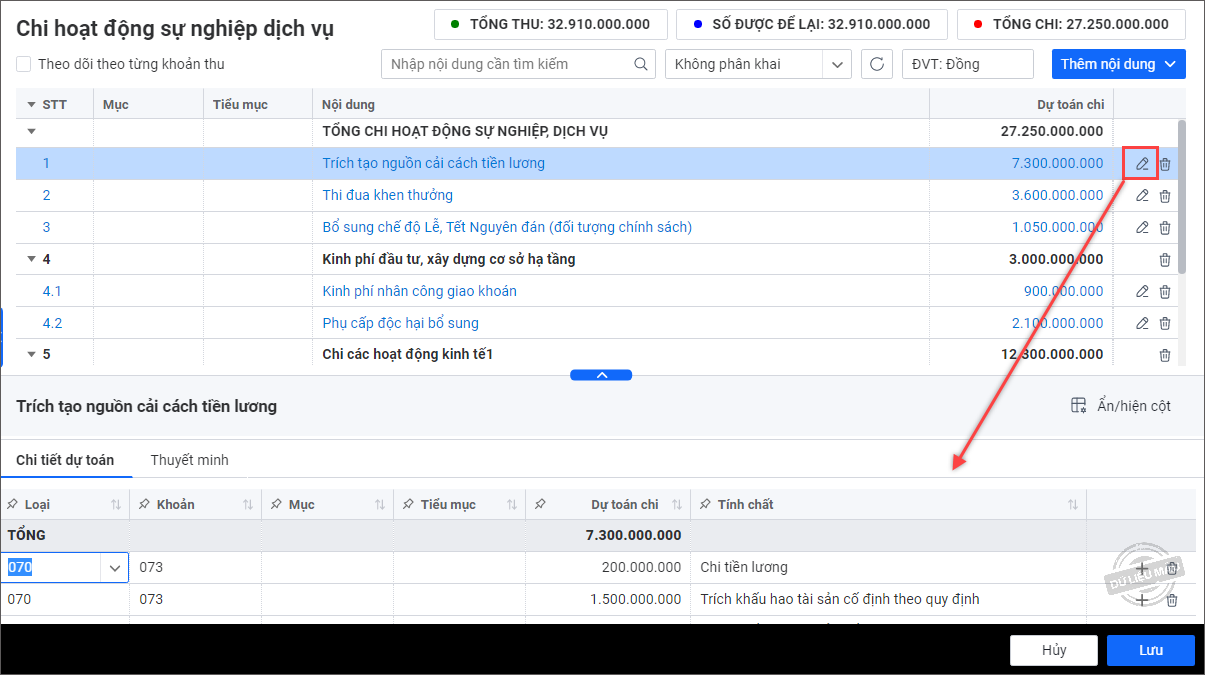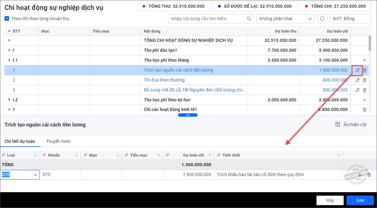 3. Nhập dự toán cho các nội dung thu hoạt động sự nghiệp, dịch vụ. Sau đó nhấn Lưu.