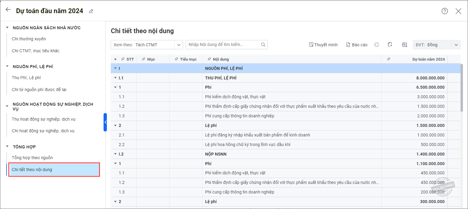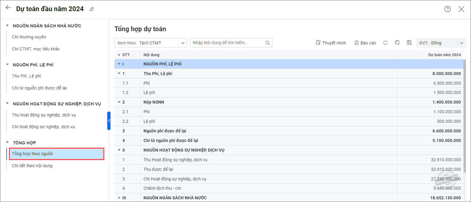 Sau khi lập dự toán đầu năm, đơn vị có thể xem được số liệu tổng hợp dự toán bằng cách: