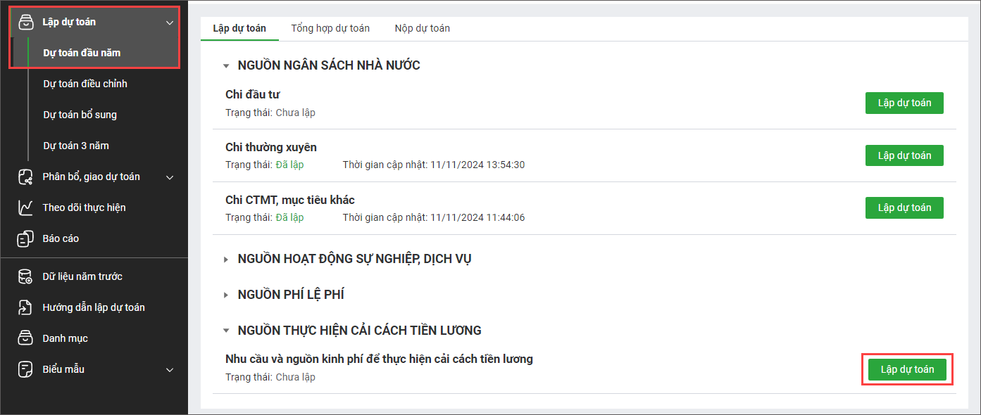 2. Tại Nguồn thực hiện cải cách tiền lương, nhấn Lập dự toán.