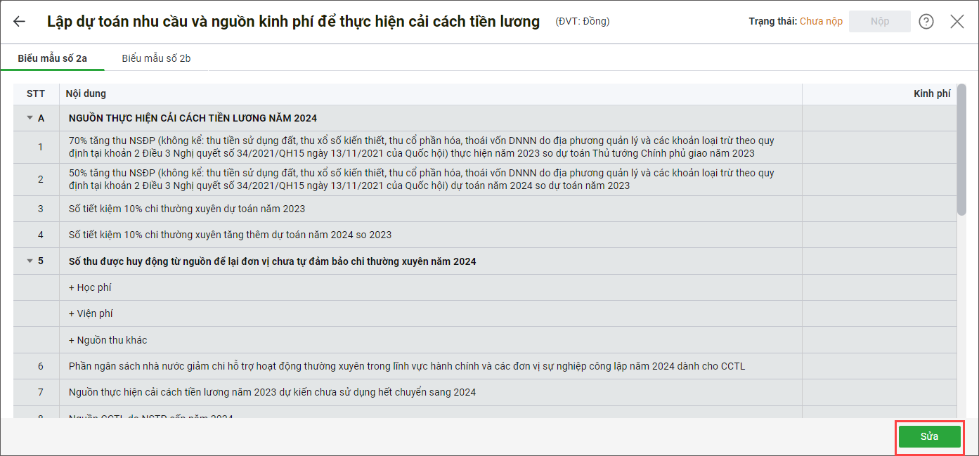 3. Phần mềm đáp ứng cho đơn vị Biểu mẫu số 2a và Biểu mẫu số 2b. Nhấn Sửa.