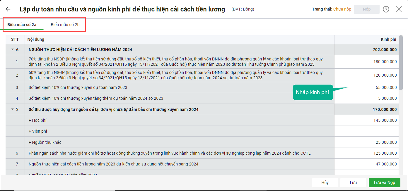 4. Thực hiện nhập kinh phí tương ứng với từng nội dung.