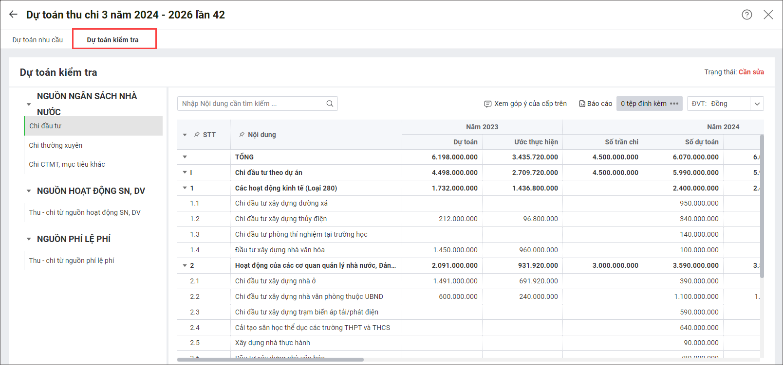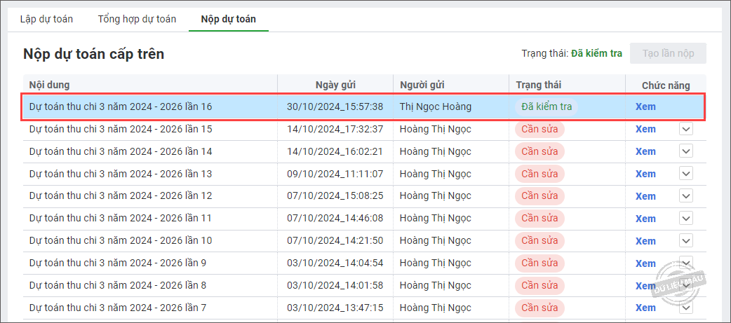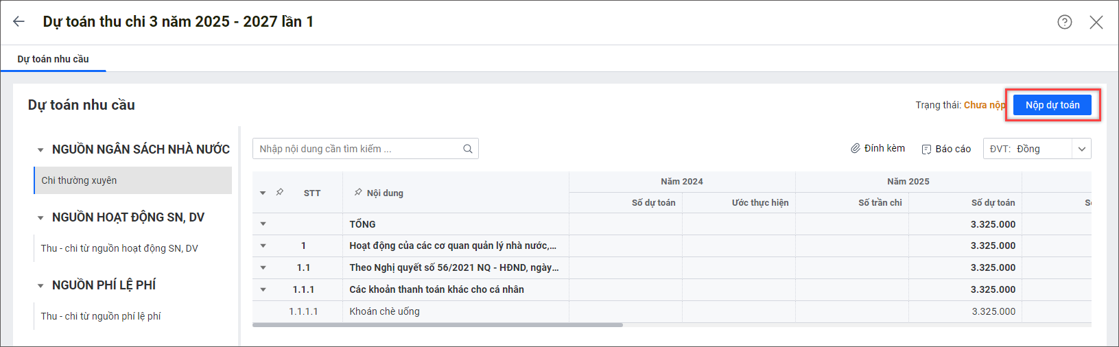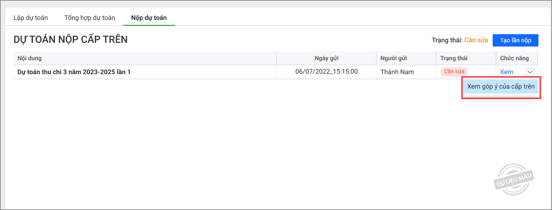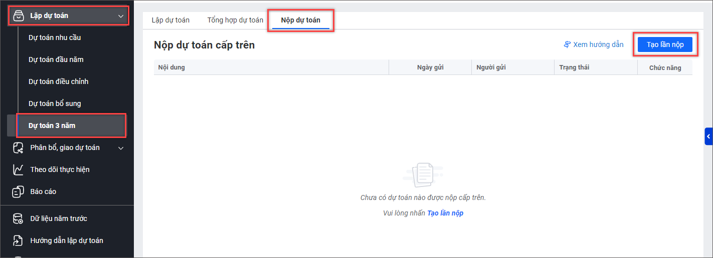 Đơn vị sử dụng ngân sách nộp dự toán 3 năm lên cấp trên Giúp đơn vị sử dụng ngân sách nộp dự toán 3 năm lên cấp trên và xem kết quả nộp. Xem phim hướng dẫn: Nộp dự toán lên cấp trên 1. Vào menu Lập dự toán > Dự toán 3 năm. 2. Vào tab Nộp dự toán. 3. Nhấn Tạo lần nộp. 4. Có thể tải lên các biểu mẫu lập ngoài phần mềm để nộp kèm bằng cách nhấn vào Đính kèm. 5. Kiểm tra lại số liệu và nhấn Nộp dự toán. Nhận và xem kết quả nộp dự toán Trường hợp 1: Dự toán có trạng thái Cần sửa Xem góp ý của cấp trên (nếu có). Sau đó sửa lại dự toán theo góp ý của cấp trên và nộp lại bằng cách nhấn vào chức năng Tạo lần nộp. Nhấn Xem để xem dự toán kiểm tra chi tiết của cấp trên tại tab Dự toán kiểm tra như sau: Trường hợp 2: Dự toán có trạng thái Đã kiểm tra Dự toán đã được cấp trên kiểm tra và phê duyệt. Cập nhật 10/04/2025 Bài viết này hữu ích chứ? Có Không Bài viết liên quan Đơn vị sử dụng ngân sách nộp dự toán đầu năm lên cấp trên Đơn vị sử dụng ngân sách lập dự toán đầu năm Đơn vị sử dụng ngân sách lập dự toán nhu cầu Đơn vị sử dụng ngân sách nhận quyết định giao dự toán từ cấp trên [Sở GTVT HCM] Đơn vị sử dụng ngân sách lập dự toán nguồn thực hiện cải cách tiền lương Đơn vị sử dụng ngân sách tổng hợp dự toán 3 năm