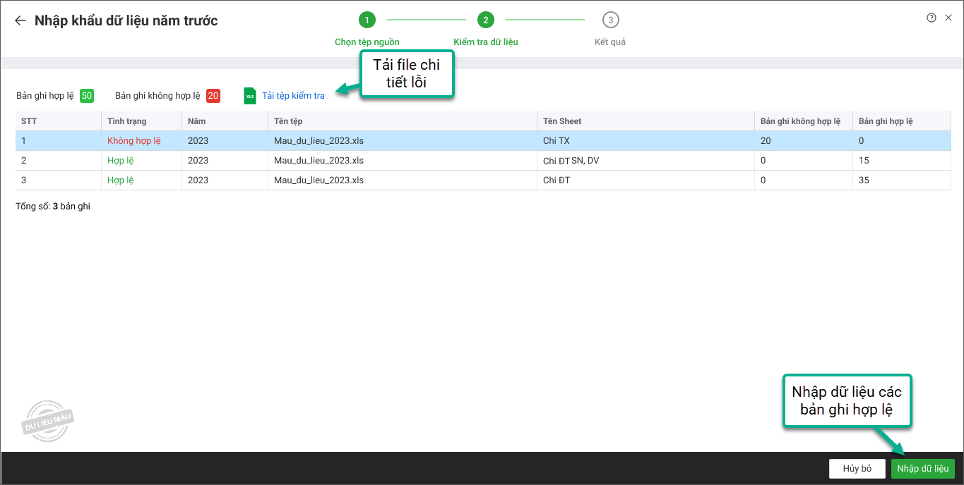 3. Nhấn Nhập dữ liệu để tải các bản ghi hợp lệ vào phần mềm.