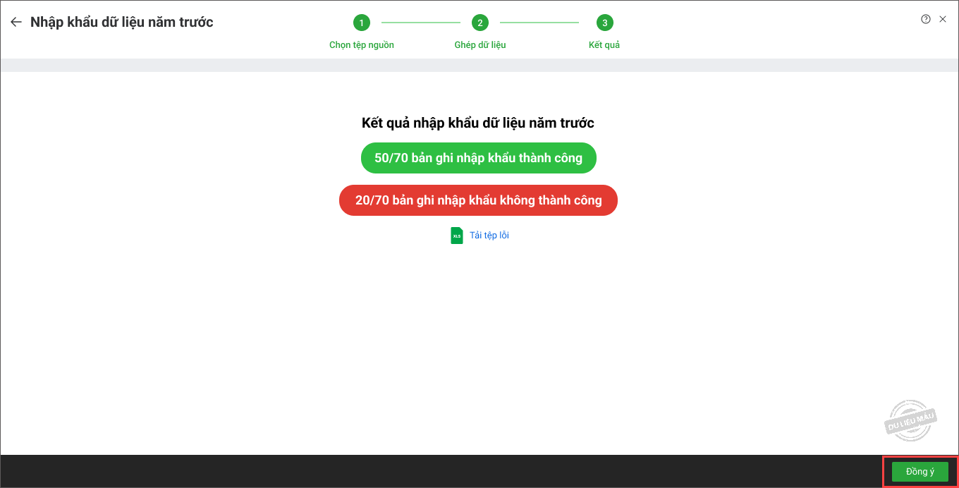 2. Nếu có bản ghi nhập khẩu không thành công, nhấn Tải tệp lỗi để xem nguyên nhân lỗi trên file excel (tương tự Bước 2).
