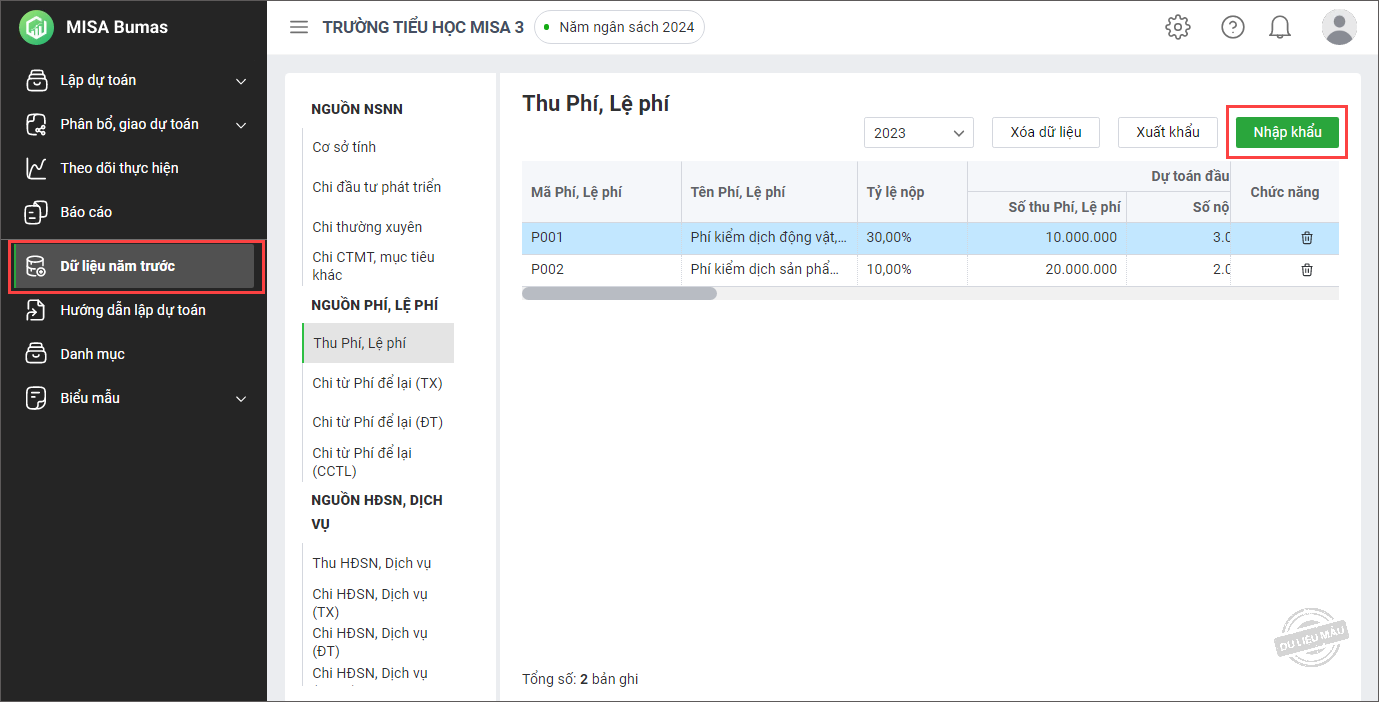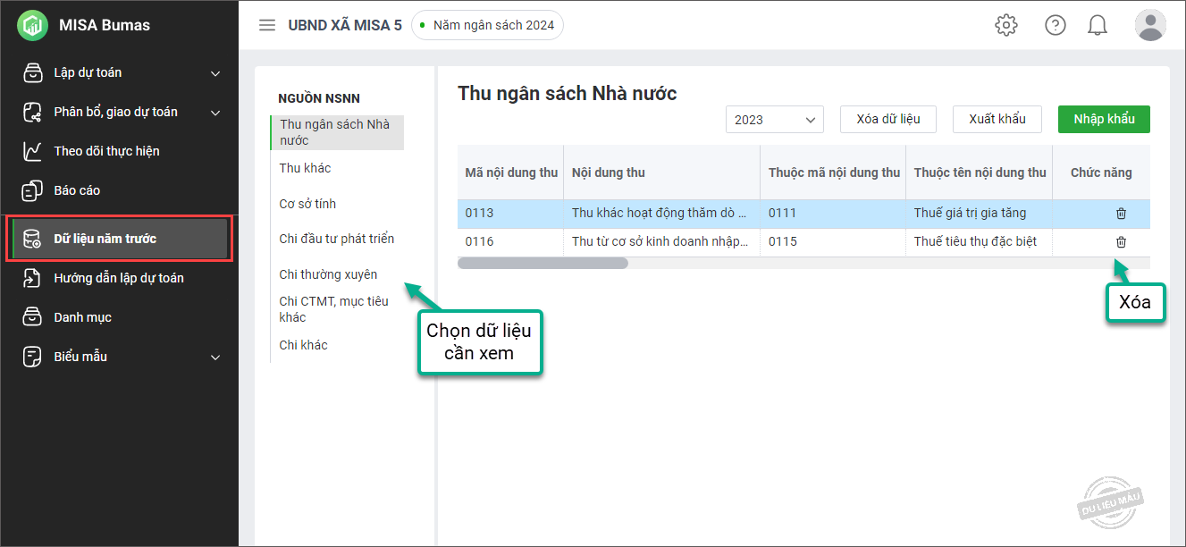 - Vào menu Dữ liệu năm trước. Chọn 1 nội dung bất kì muốn nhập khẩu.