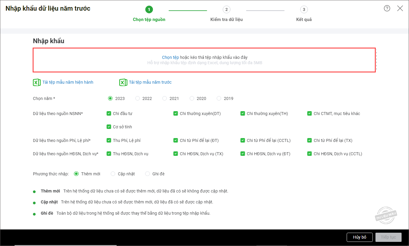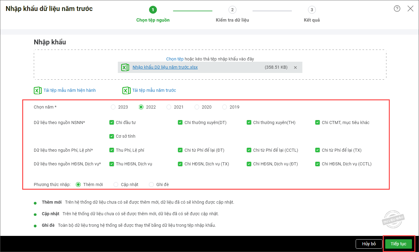 9. Tích chọn 1 phương thức nhập: Thêm mới, Cập nhật hoặc Ghi đè.