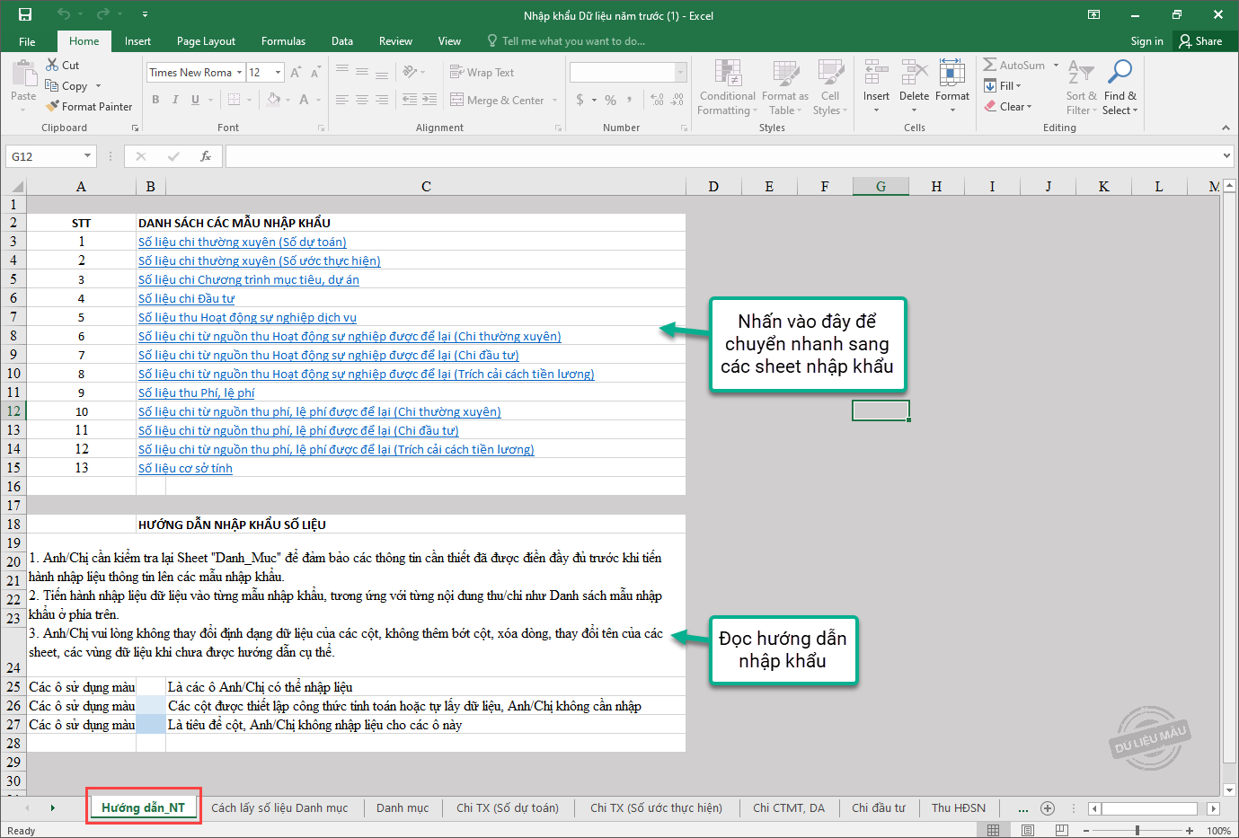 - Chọn sheet Hướng_dẫn_NT để xem hướng dẫn chi tiết cách nhập khẩu.