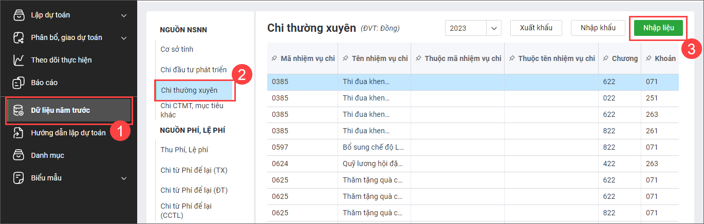 - Tại mục Chi thường xuyên, nhấn Nhập liệu.