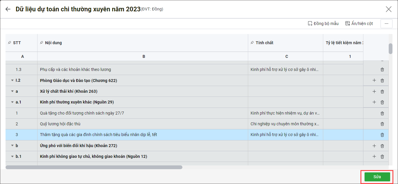 - Phần mềm tự động lấy dữ liệu từ dự toán đầu năm Chi thường xuyên đã lập. Nhấn Sửa.