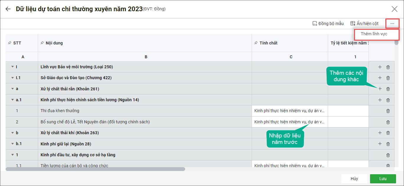 - Nhập dữ liệu cho từng nội dung. Nhấn Lưu.