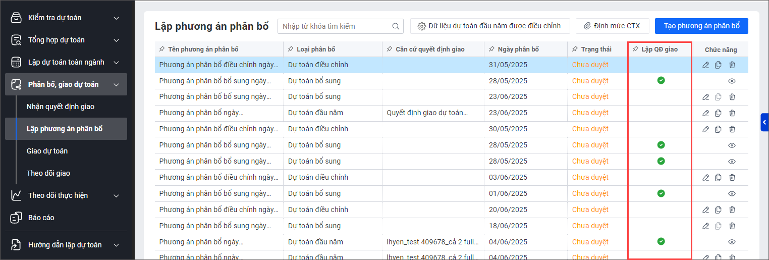 Kể từ phiên bản R9: Phần mềm bổ sung thông tin Lập quyết định giao ở màn hình danh sách phương án phân bổ để đơn vị chủ quản biết được phương án phân bổ nào đã được lập quyết định giao.