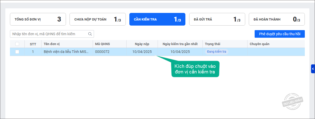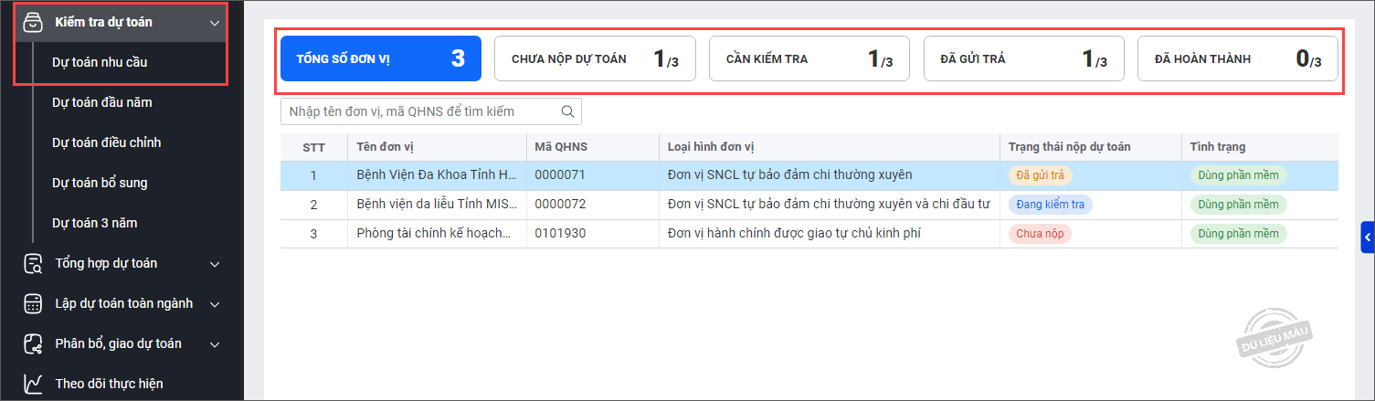 – Cần kiểm tra: Xem các đơn vị đã nộp dự toán nhưng chưa được kiểm tra hoặc chưa hoàn thành kiểm tra.