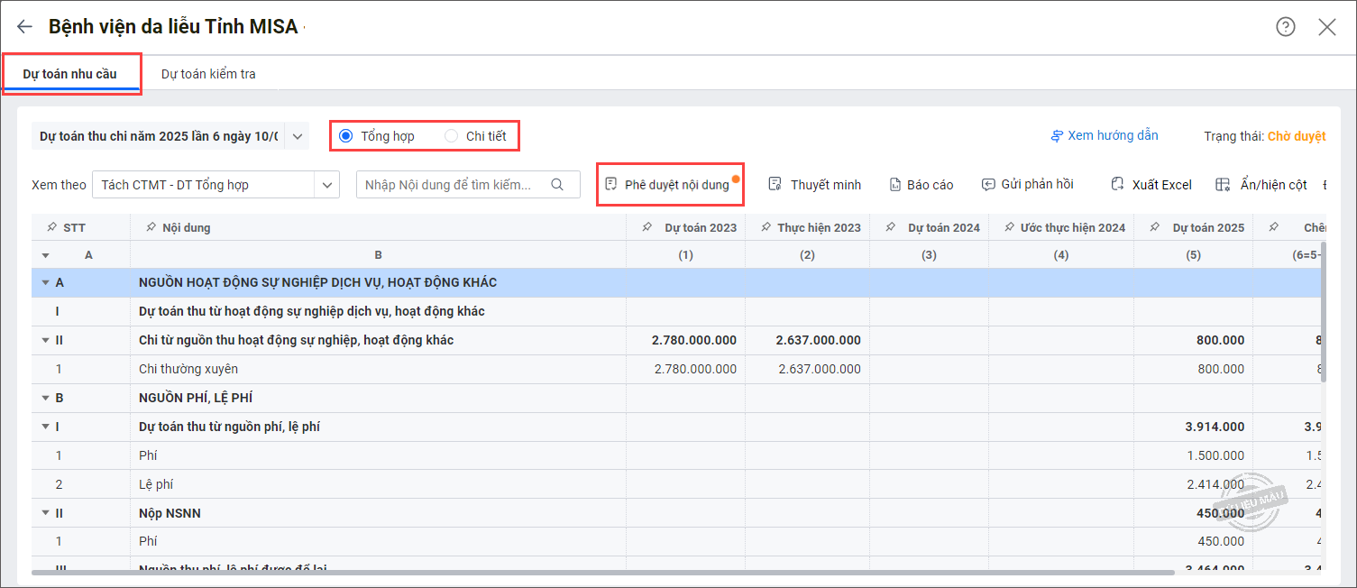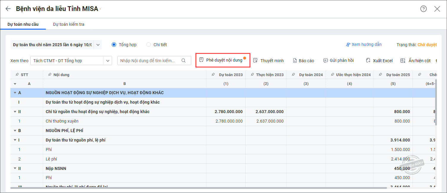 1. Tại tab Dự toán nhu cầu, nhấn Phê duyệt nội dung.