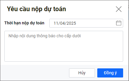 - Nhập nội dung vào thông báo Yêu cầu nộp dự toán, rồi nhấn Đồng ý để gửi cho đơn vị cấp dưới.