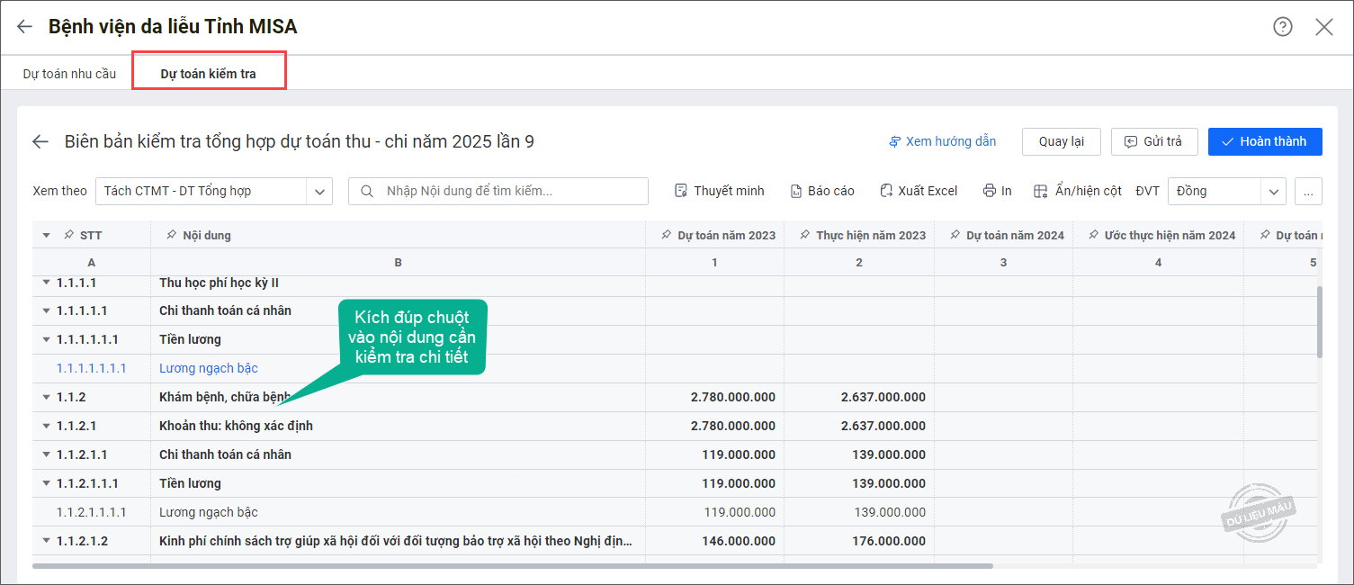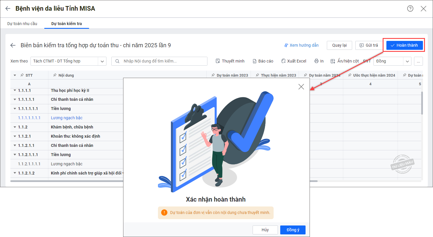 – Đã hoàn thành: Xem các đơn vị đã hoàn thành kiểm tra dự toán.