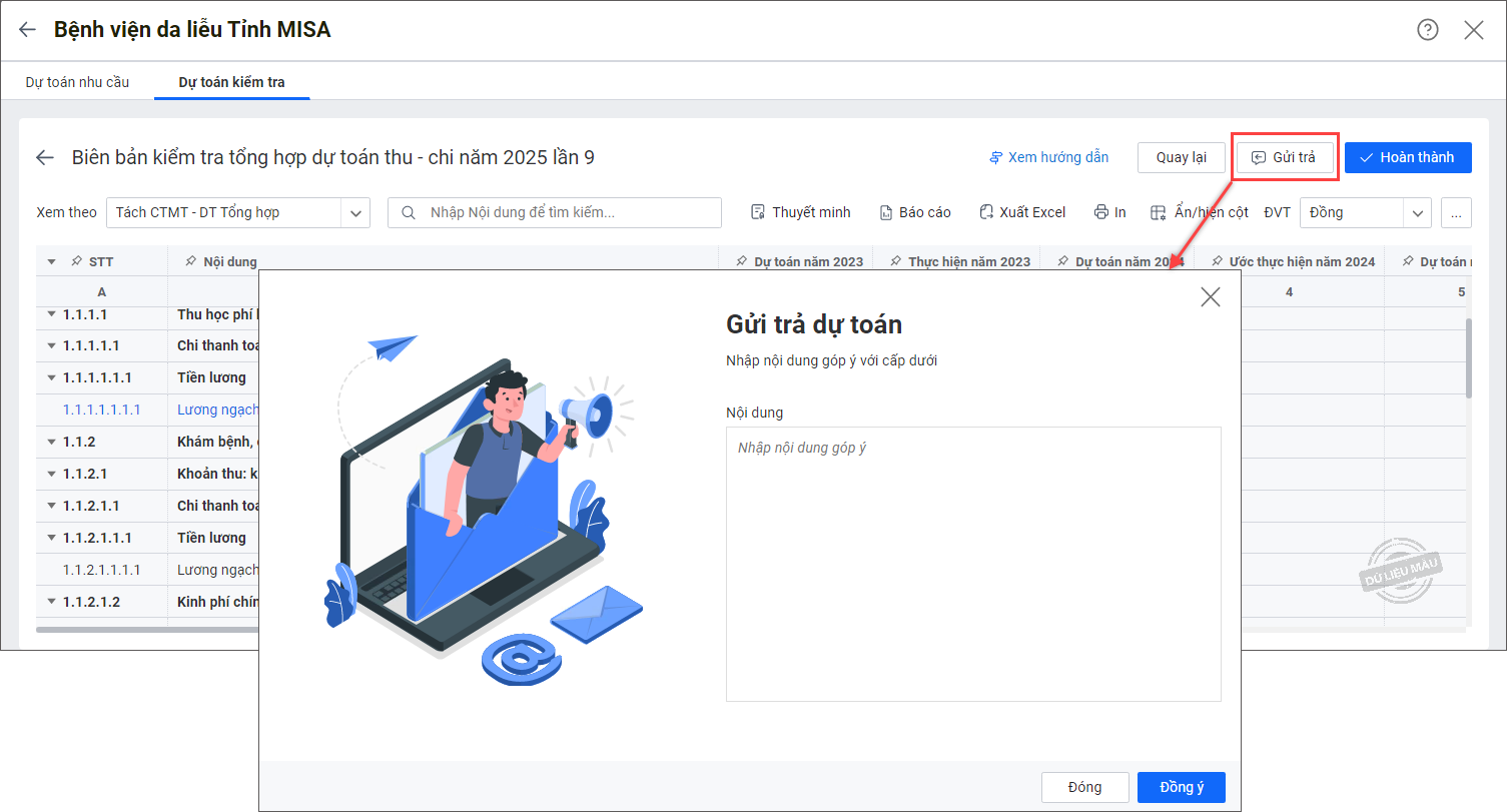 - Nhấn Đồng ý để xác nhận hoàn thành kiểm tra dự toán và không gửi trả cho cấp dưới.