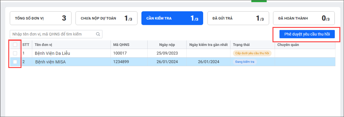 4. Với những đơn vị trực thuộc mà đơn vị chưa tạo biên bản kiểm tra hoặc đang kiểm tra dự toán, đơn vị được phép gửi yêu cầu thu hồi dự toán để chỉnh sửa (trạng thái là Cấp dưới yêu cầu thu hồi), lúc này đơn vị cần phê duyệt yêu cầu thu hồi như sau: