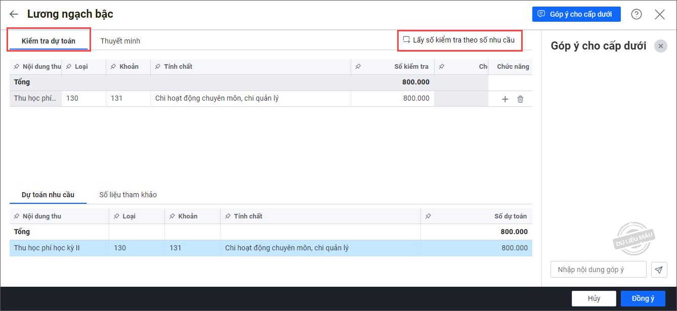 - Nếu dự toán nhu cầu mà cấp dưới gửi lên đã đúng và đủ thì anh/chị có thể lấy nhanh số kiểm tra theo số nhu cầu để không phải nhập lại.