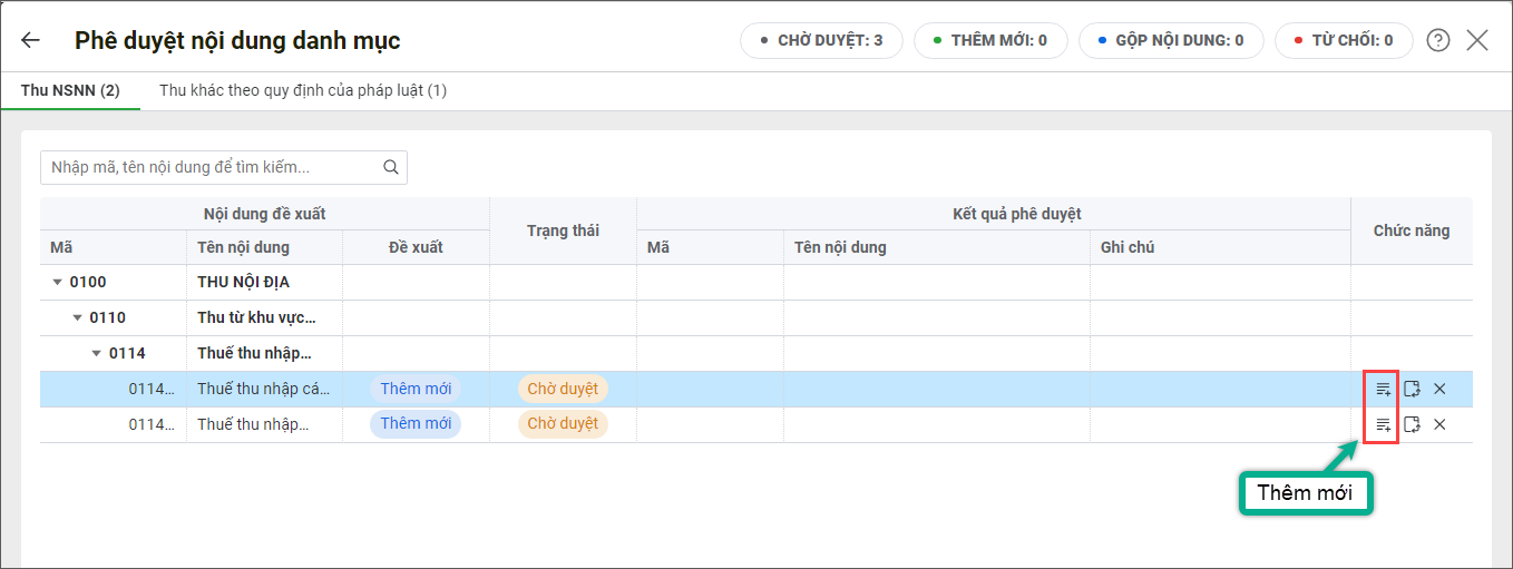 – Nếu nội dung mà cấp dưới đề xuất hợp lý thì thực hiện phê duyệt bằng cách chọn Thêm mới để thêm nội dung này vào danh mục.