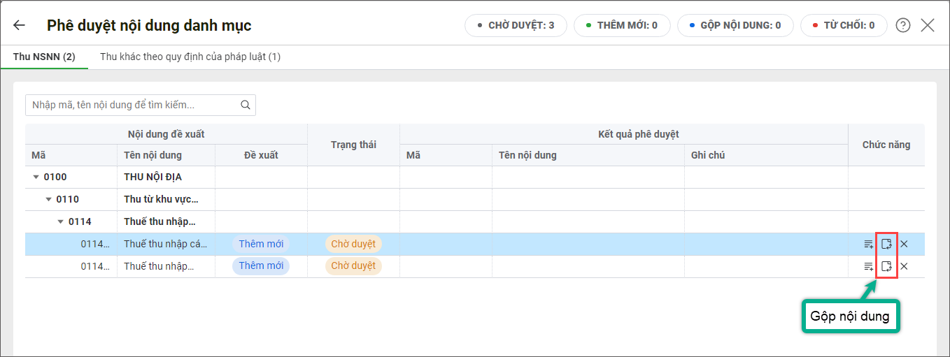 – Nếu nội dung mà cấp dưới đề xuất có thể gộp vào nội dung sẵn có thì chọn Gộp nội dung.