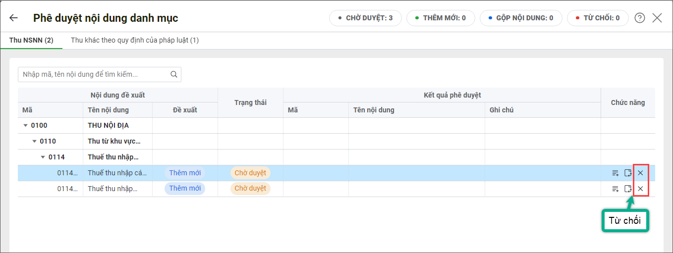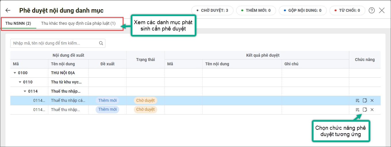 2. Chọn vào danh mục cần phê duyệt nội dung. Ví dụ: Thu NSNN có 2 nội dung cần phê duyệt.