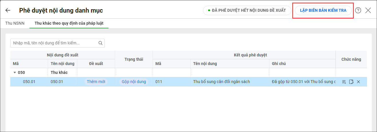 *Lưu ý: Khi chưa tạo biên bản kiểm tra, đơn vị vẫn có thể thay đổi được hình thức phê duyệt nội dung. Ví dụ ban đầu là Thêm mới nhưng sau đó có thể thay đổi lại là Gộp nội dung hoặc Từ chối.