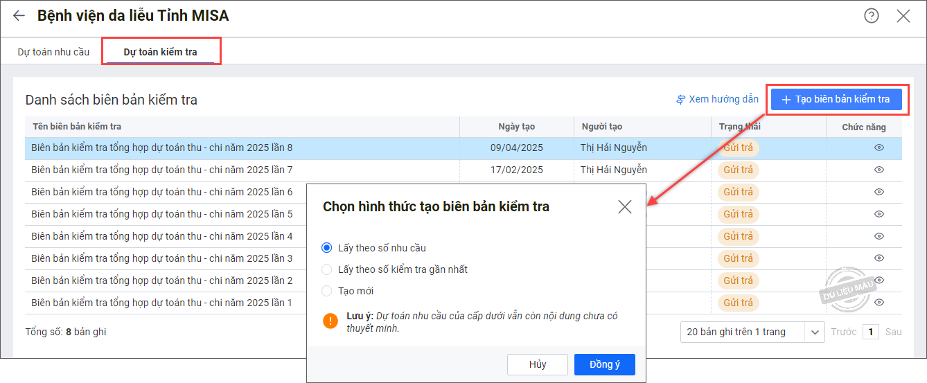 - Lấy theo số nhu cầu: Biên bản kiểm tra được tạo với toàn bộ thông tin lấy theo bảng Dự toán nhu cầu của lần nộp lên gần nhất.
