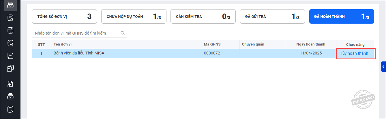 - Trường hợp dự toán của đơn vị trực thuộc đã được xác nhận hoàn thành nhưng đơn vị chủ quản muốn kiểm tra lại thì vào danh sách các đơn vị Đã hoàn thành, nhấn Hủy hoàn thành tại đơn vị đó.