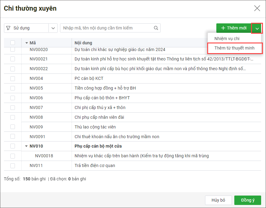 4. Thực hiện thêm mới nhiệm vụ chi từ kho thuyết minh bằng cách nhấn vào biểu tượng ⏷ Thêm mới, chọn Thêm từ thuyết minh.