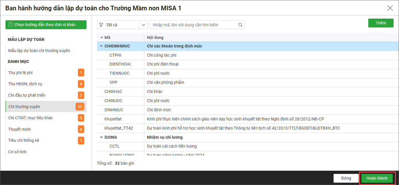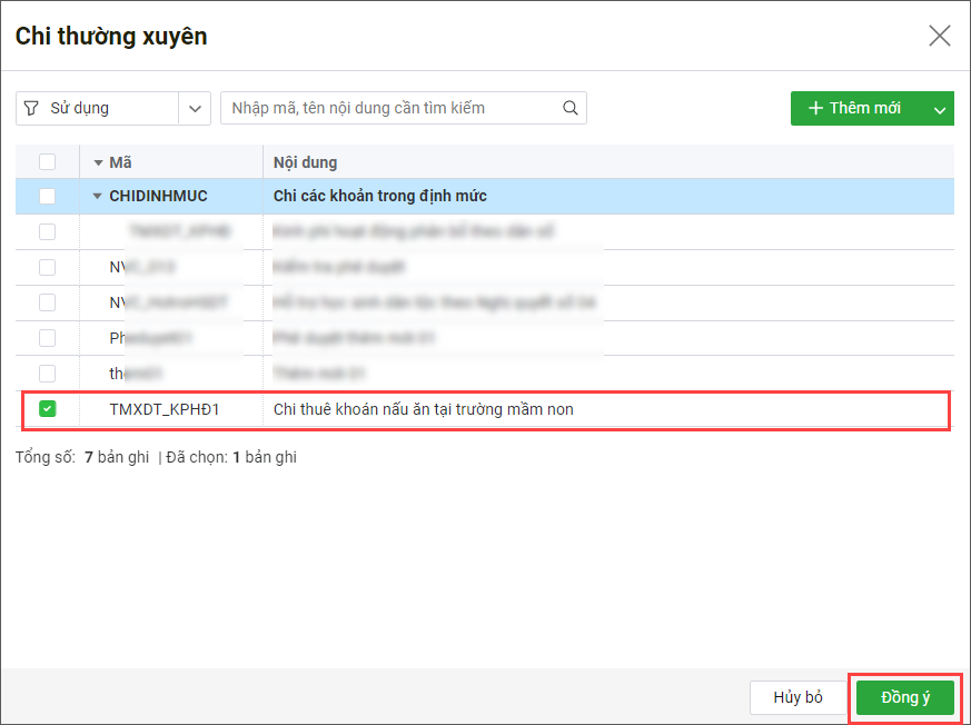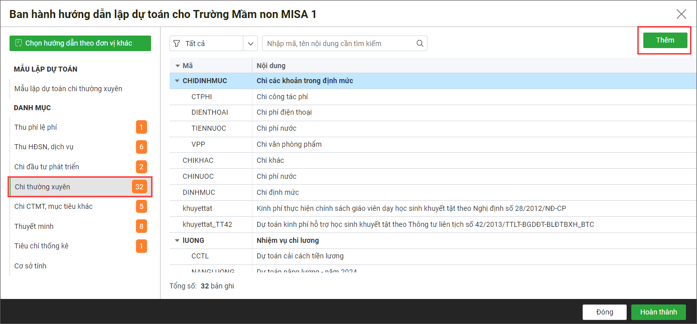 3. Chọn danh mục Chi thường xuyên. Nhấn Thêm.