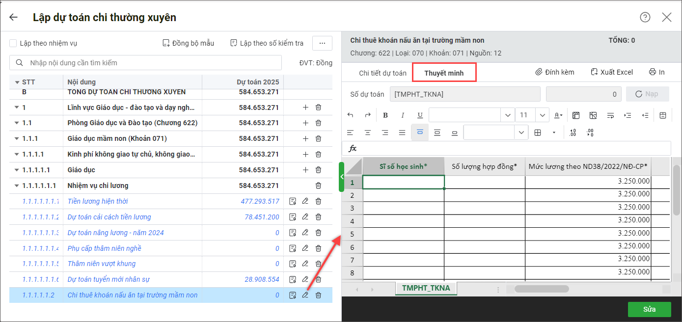 2. Khi lập dự toán Chi thường xuyên, với các nhiệm vụ được cấp trên ban hành kèm thuyết minh chi tiết, đơn vị chỉ cần nhập số liệu theo mẫu thuyết minh đính kèm. Hệ thống sẽ mặc định sẵn công thức tính Số dự toán và tự động tính toán dựa trên dữ liệu đơn vị nhập vào mẫu thuyết minh.