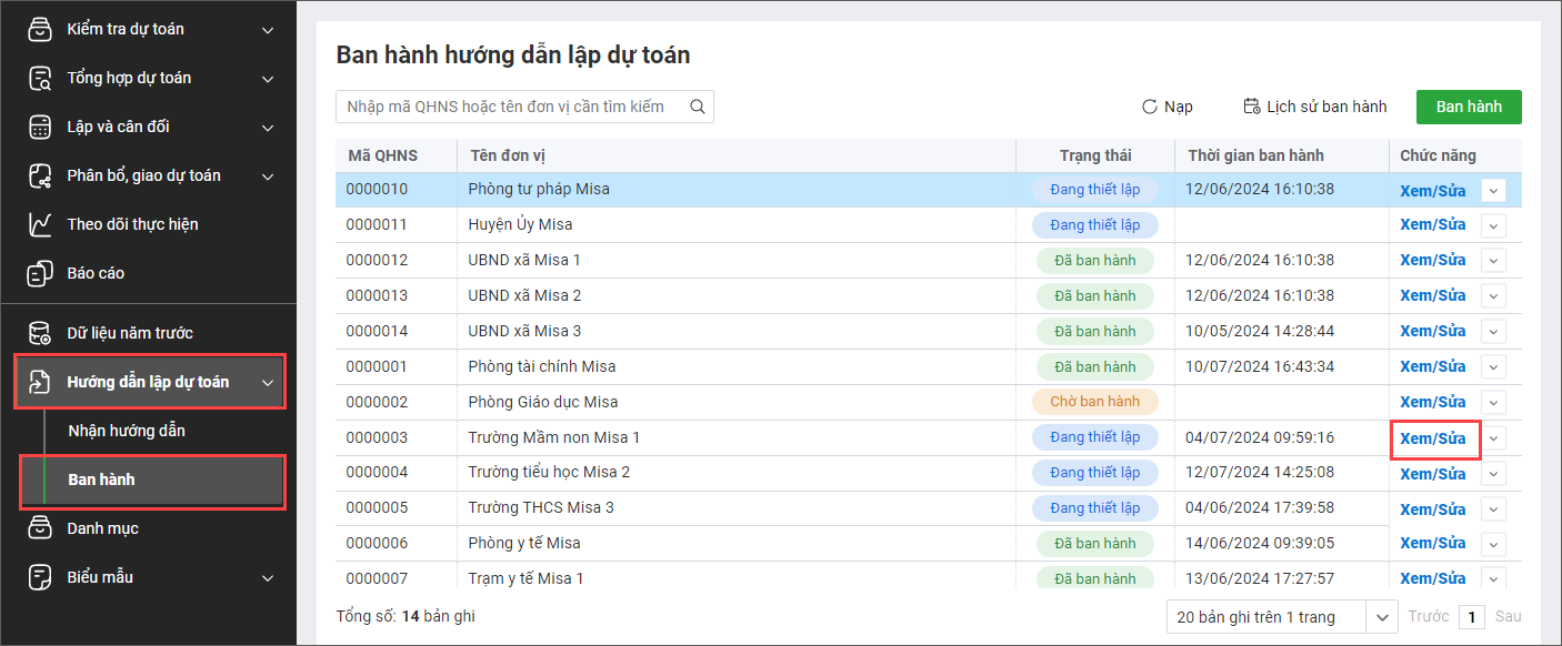 9. Nhấn Ban hành để ban hành hướng dẫn lập dự toán cho cấp dưới.