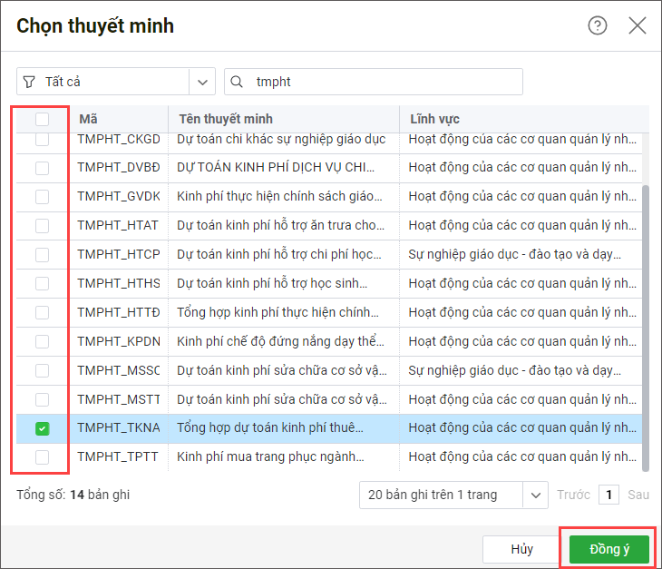 5. Tại đây hệ thống đã mặc định sẵn các mẫu thuyết minh đặc thù của đơn vị. Tích chọn thuyết minh cần thêm rồi nhấn Đồng ý.