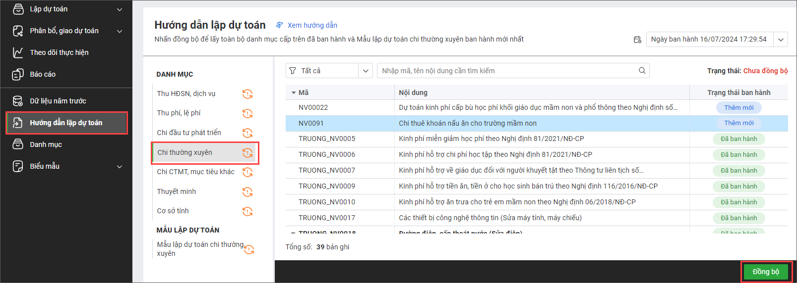 *Lưu ý: Khi đồng bộ danh mục Chi thường xuyên, danh mục Thuyết minh và Cơ sở tính sẽ được tự động cập nhật theo.