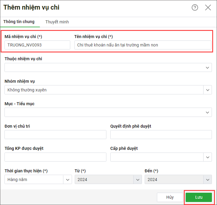 - Chọn thêm các thông tin khác như Thuộc nhiệm vụ chi, Nhóm nhiệm vụ,…