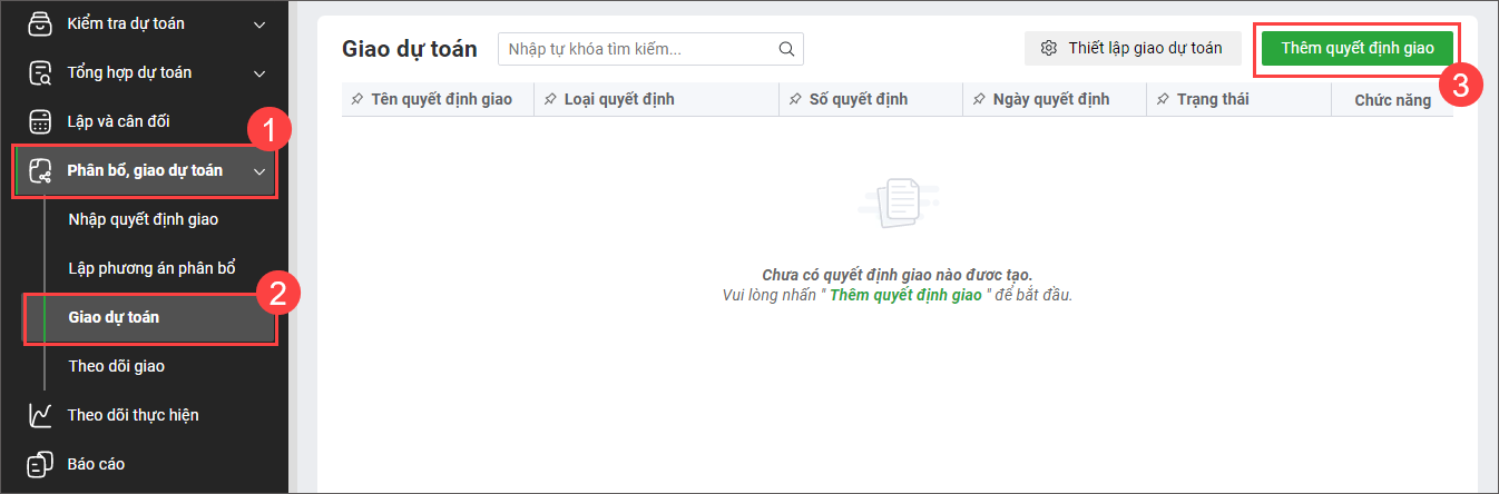 3. Nếu chưa có quyết định giao nào được tạo trước đó, nhấn Thêm quyết định giao.