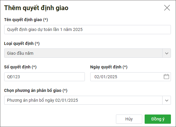 - Nhập các thông tin: Tên quyết định giao, Số quyết định, Ngày quyết định.