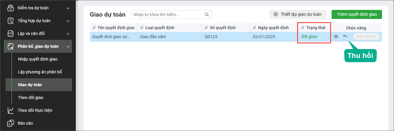 8. Sau khi giao dự toán, trạng thái của quyết định giao đó chuyển thành Đã giao. Nếu muốn thu hồi quyết định giao, nhấn vào biểu tượng Thu hồi.