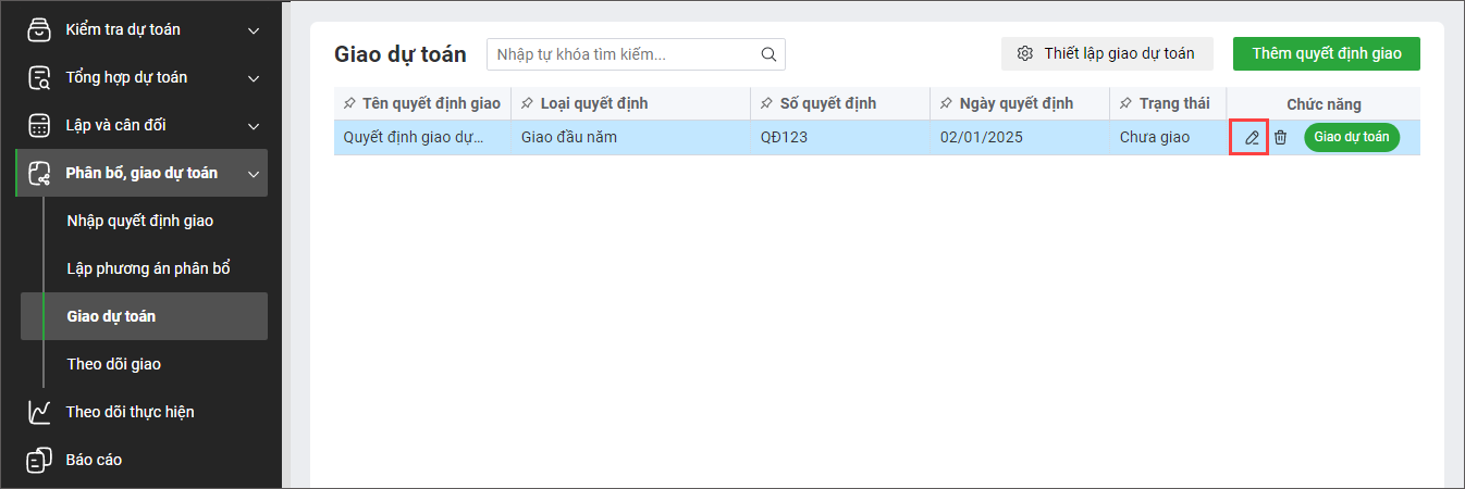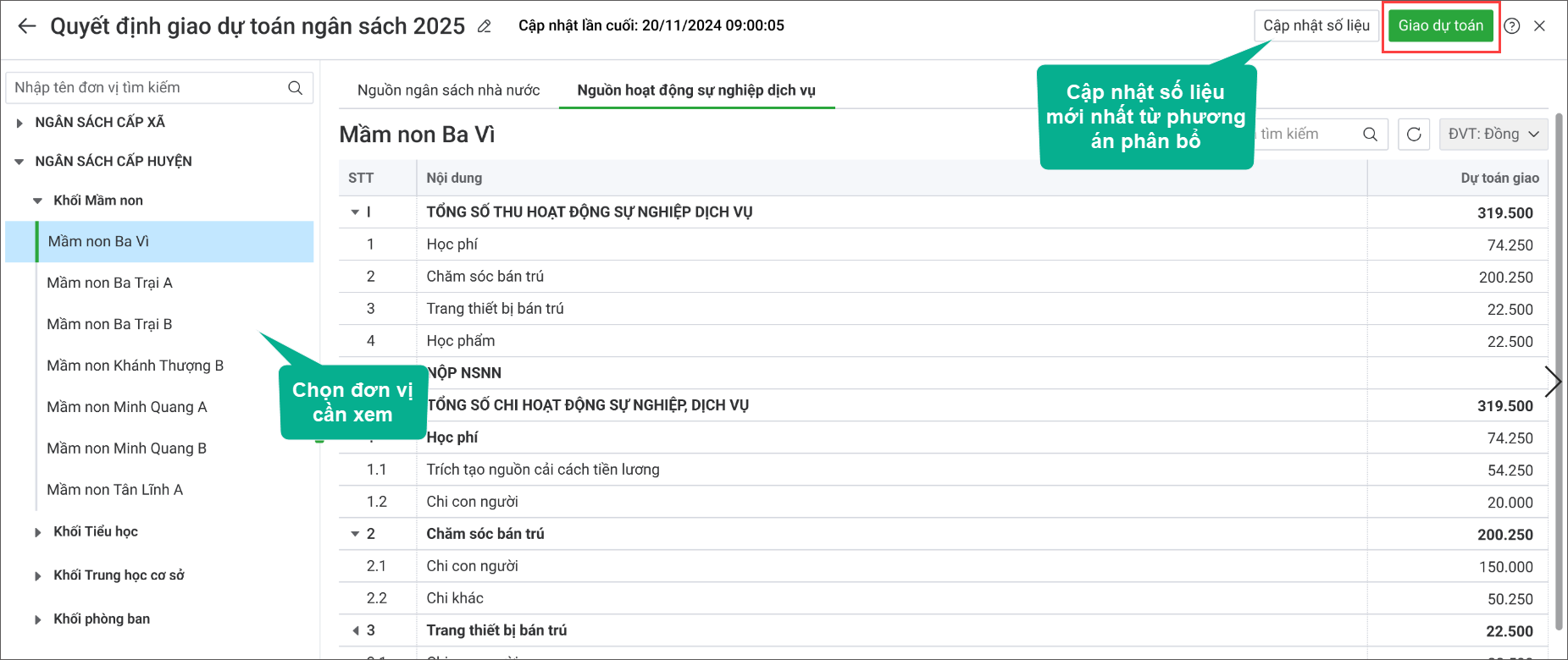 7. Sau khi kiểm tra xong, nhấn Giao dự toán để gửi quyết định giao xuống các đơn vị cấp dưới.