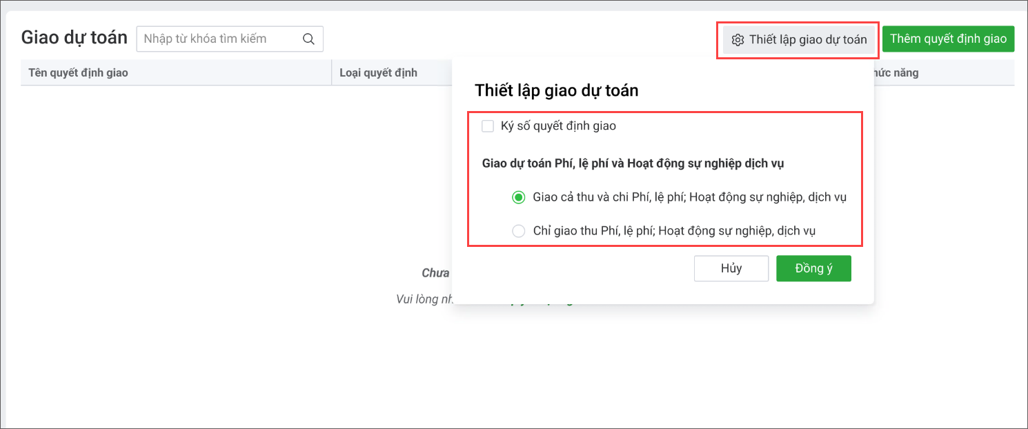 2. Để thiết lập các tùy chọn giao dự toán, nhấn vào mục Thiết lập giao dự toán.