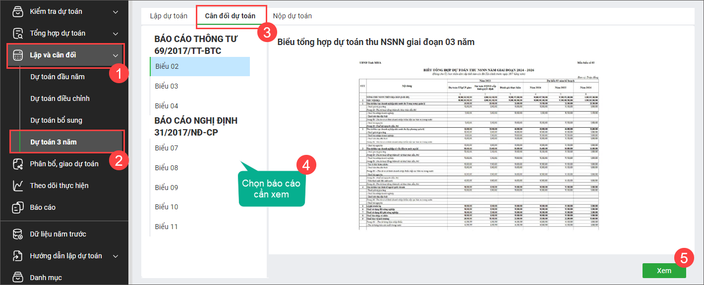 Đáp ứng cho Sở tài chính xem được một số biểu mẫu dự toán 3 năm từ số liệu tổng hợp dự toán đã lập để cân đối dự toán.