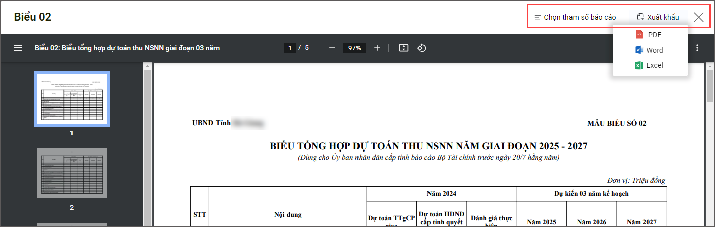 - Để xuất khẩu báo cáo, nhấn Xuất khẩu và chọn định dạng file cần xuất khẩu ra Word, Excel, PDF.